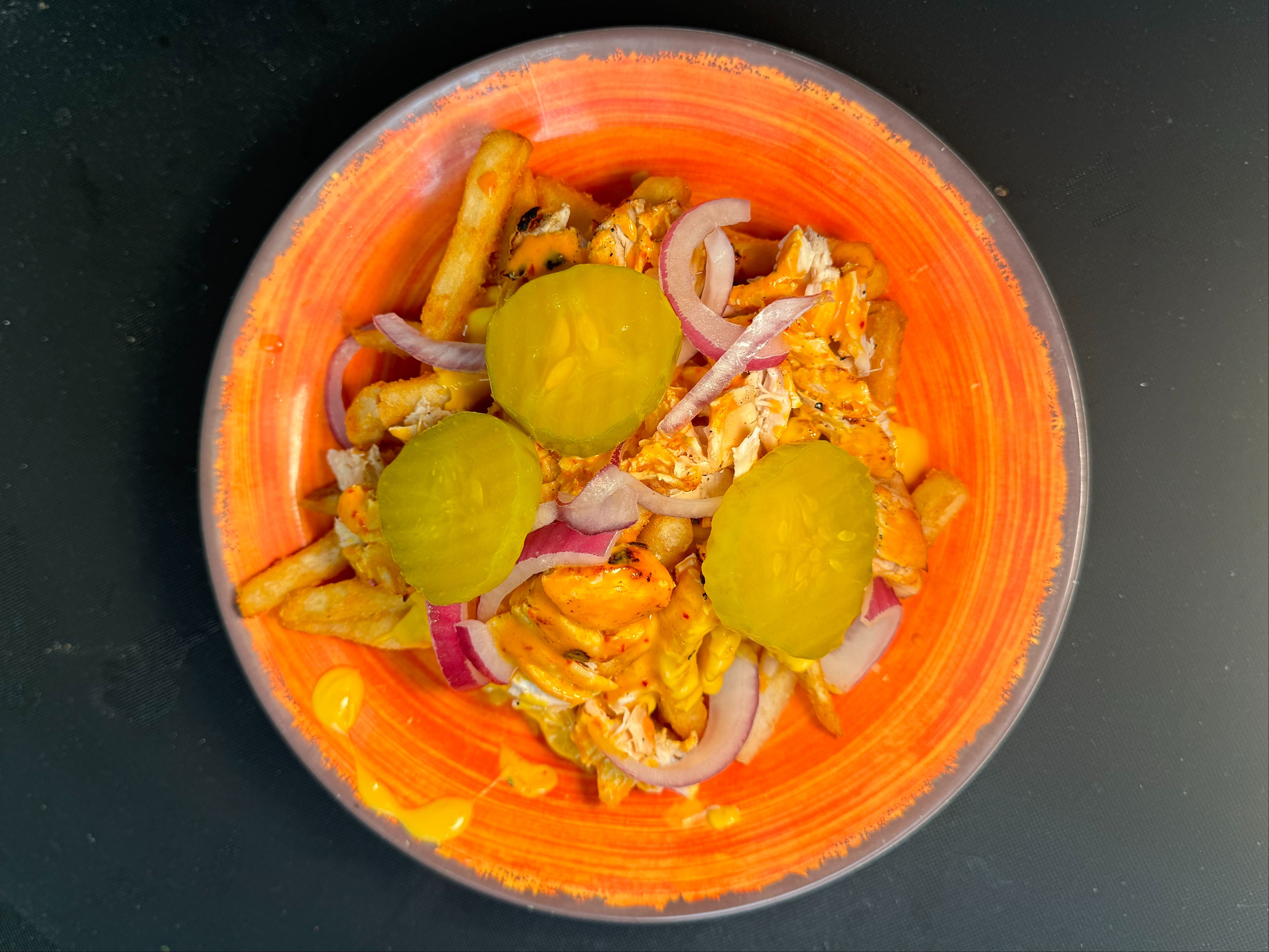 Crispy potato fries, chopped chicken tenders, jalapeños, pickles & onion topped with traditional creamy yellow nacho cheese with a touch of heat.