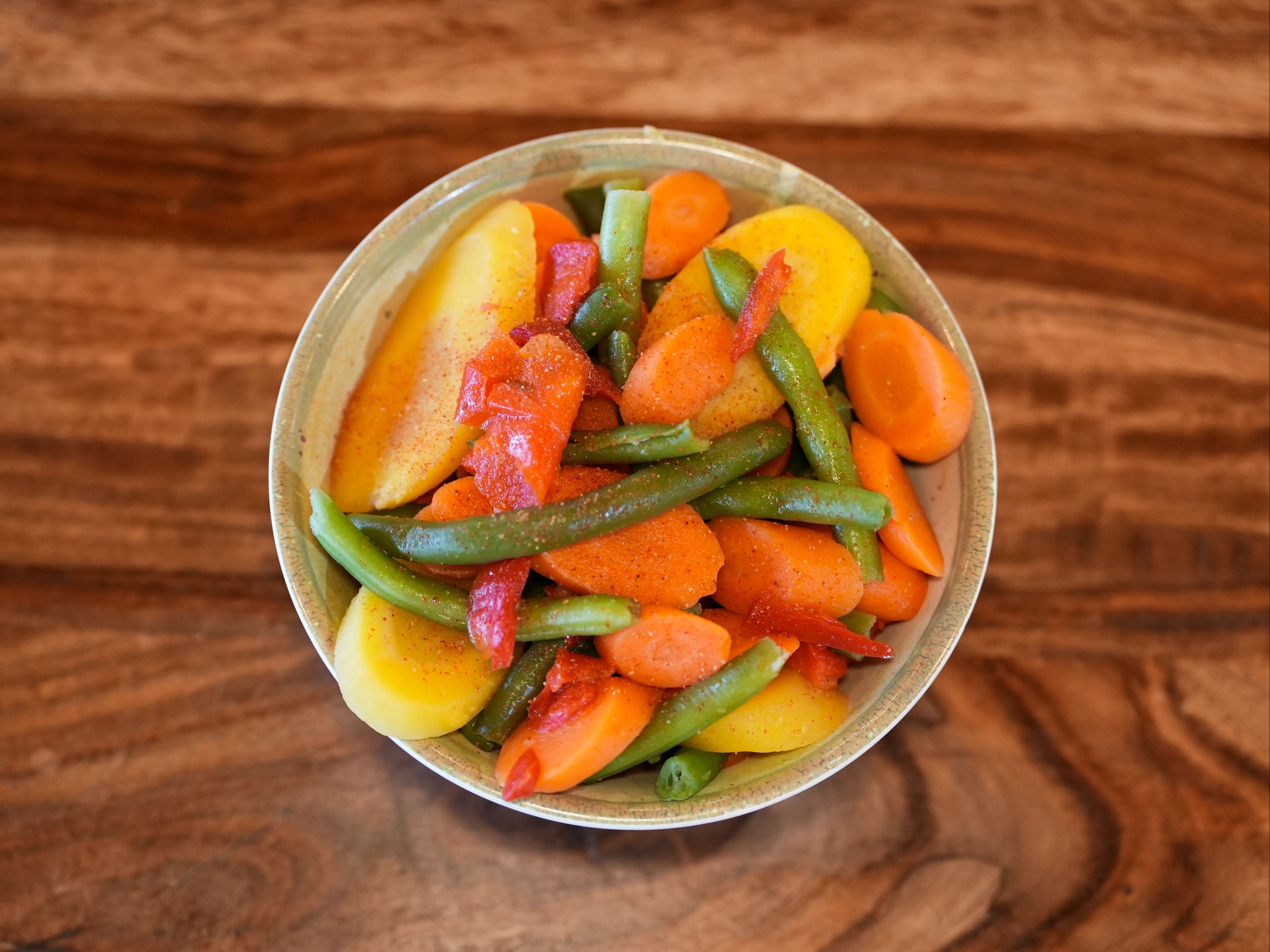 Mixed variety of gourmet vegetables. Steamed and sprinkled with our Peri seasoning. This colorful blend of vegetables includes whole green beans, sliced carrots, sliced yellow carrots, and red pepper strips.