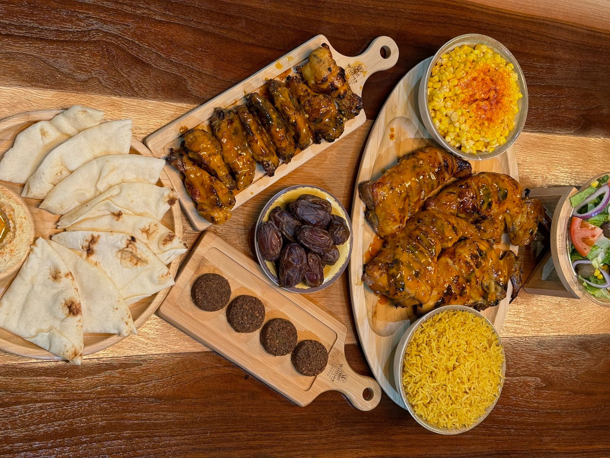 Whole chicken (4 quarters), 8 wings, 4 falafels, 3 large sides, salad, hummus & pita.