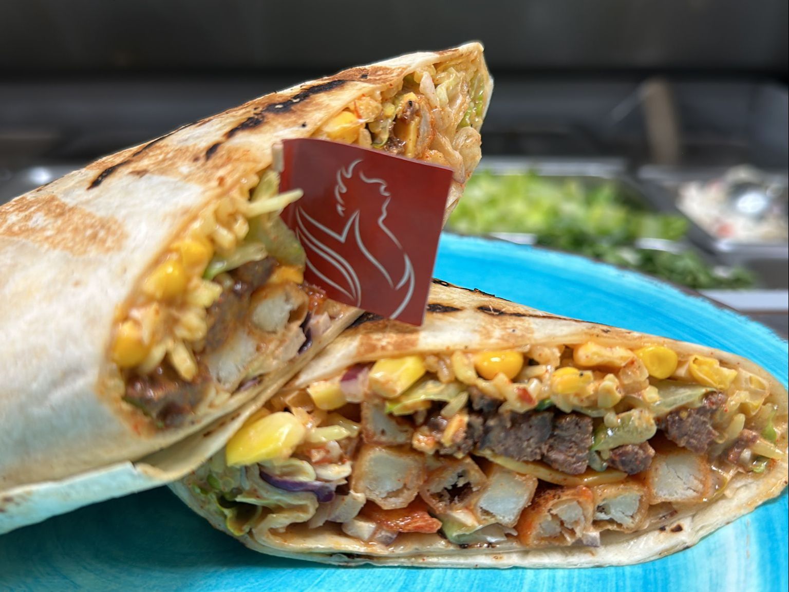 Chopped grilled beef, corn, rice, peri fries, peri mayo, cheese & fresh toppings in a toasted tortilla.