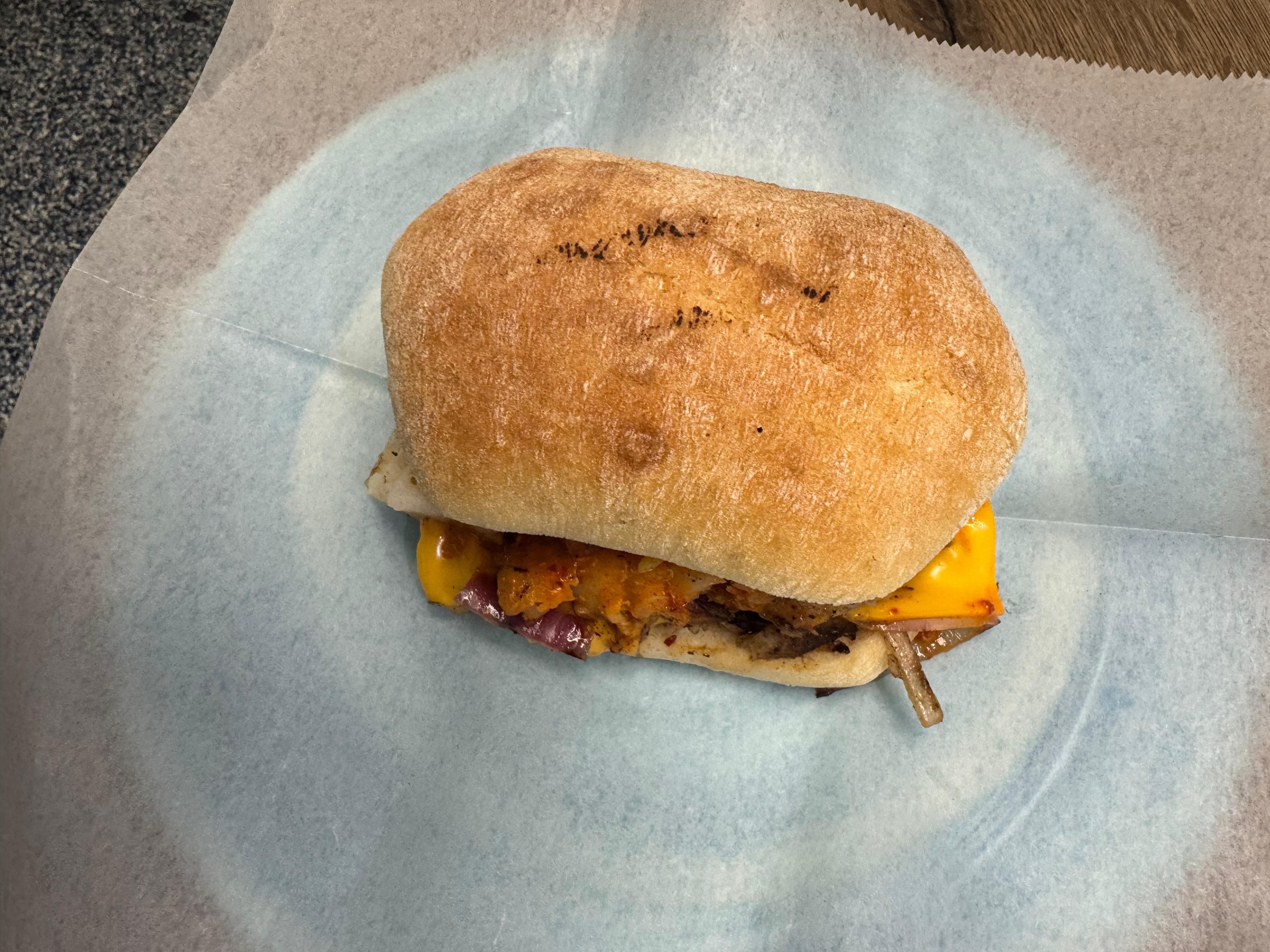 Fried veggie patty on a toasted ciabatta bun with peri mayo & fresh toppings. Vegetarian.