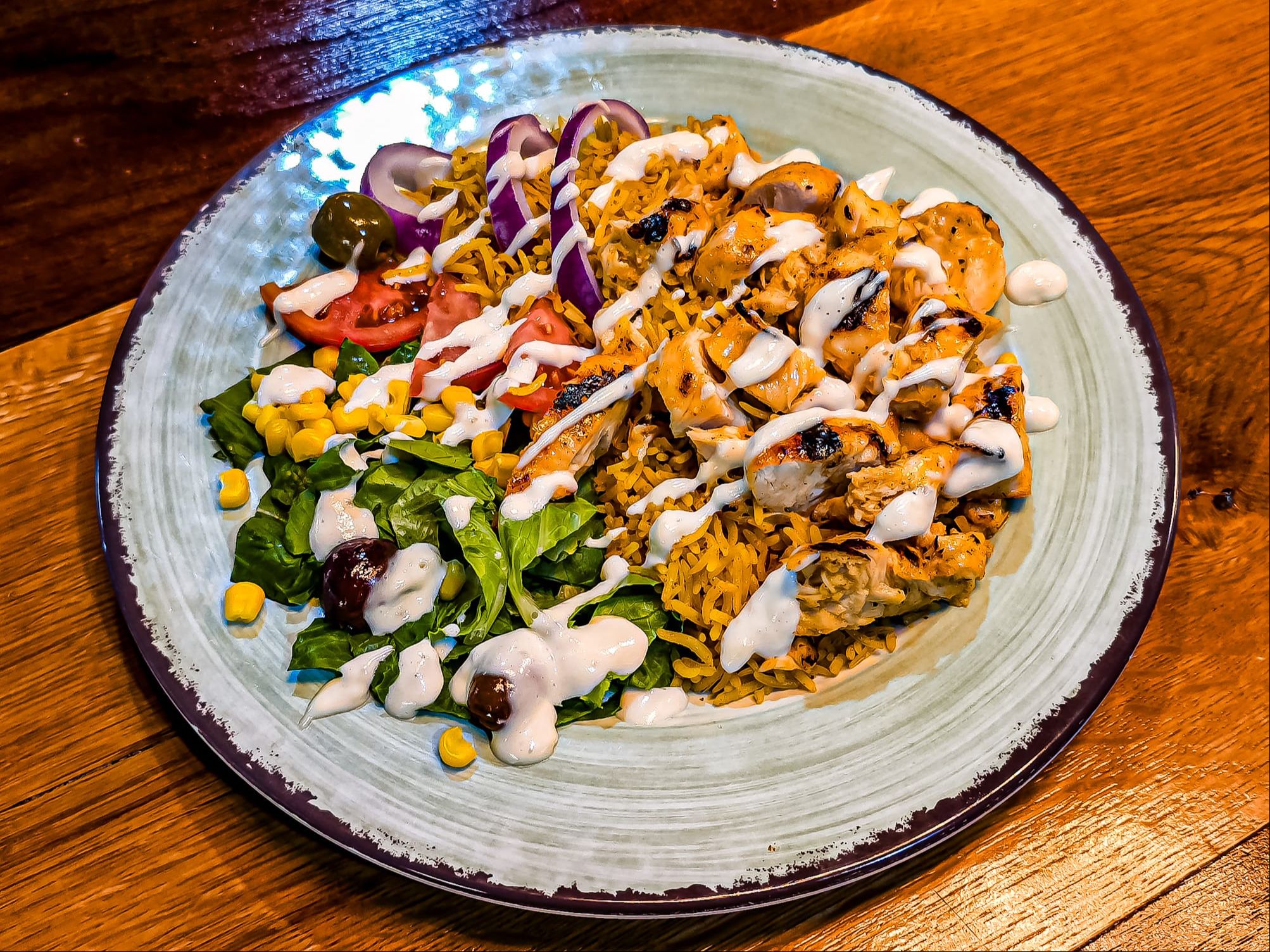 Chicken Over Rice served with your choice of Soda.