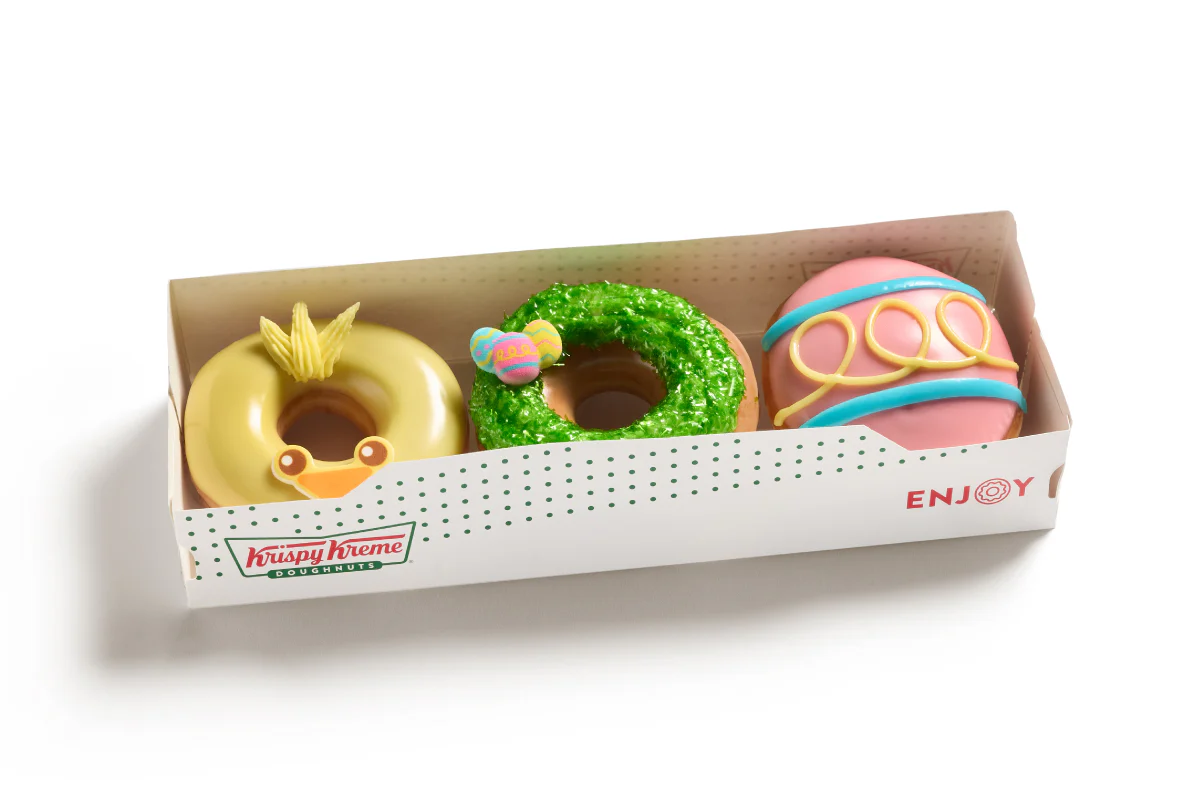 The Easter Specialty 3 Pack is a delightful bite-sized celebration of spring. This trio features: (1) Easter Egg Basket Doughnut – Original Glazed® doughnut piped with vanilla flavored buttercreme, dipped in decorative sugar, and topped with an Easter egg sugar piece. (1) Strawberry Egg Doughnut – Unglazed shell doughnut filled with white Kreme™, dipped in strawberry flavored icing with decorative vanilla flavored icing drizzles. (1) Baby Chick Doughnut – Original Glazed® doughnut dipped in vanilla flavored icing decorated with a baby chick sugar piece. Perfect for gifting, sharing, or treating yourself; it brings the joy of the season.