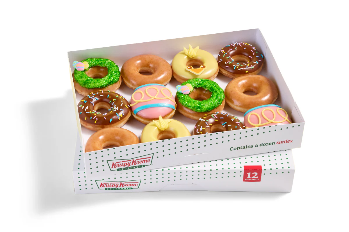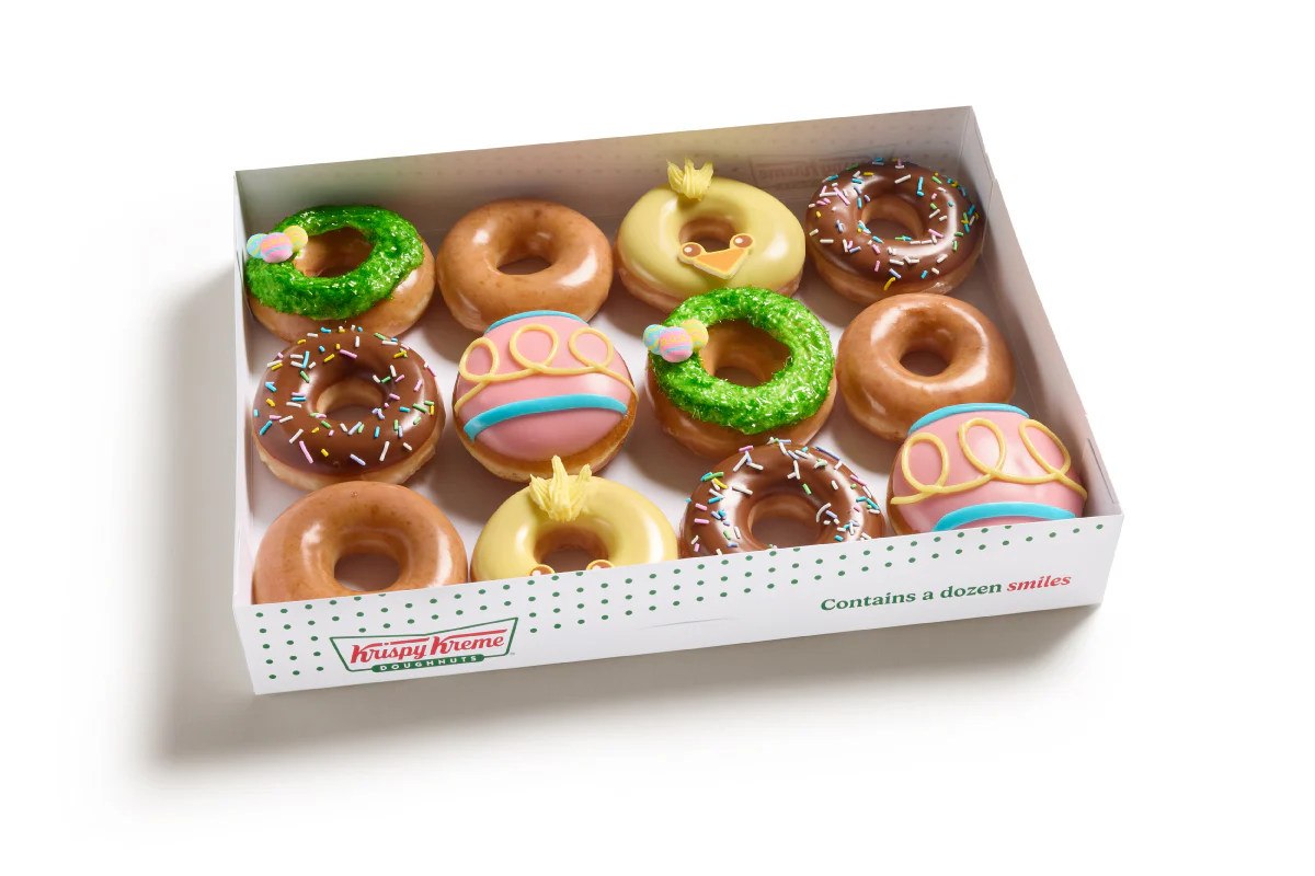 The Easter Specialty Dozen brings all the sweetness and color of the season into one festive box which includes: (2) Easter Egg Basket Doughnuts – Original Glazed® doughnut piped with vanilla flavored buttercreme, dipped in decorative sugar, and topped with an Easter egg sugar piece. (2) Strawberry Egg Doughnuts – Unglazed shell doughnut filled with white Kreme™, dipped in strawberry flavored icing with decorative vanilla flavored icing drizzles. (2) Baby Chick Doughnuts – Original Glazed® doughnut dipped in vanilla flavored icing decorated with a baby chick sugar piece. (3) Chocolate Iced with Spring Sprinkles Doughnuts (3) Original Glazed® Doughnuts It’s the perfect mix of playful designs, seasonal flavors, and Krispy Kreme favorites — ideal for sharing, gifting, or elevating any spring celebration. We'll substitute a delicious, closest match option in the event a doughnut variety becomes unavailable.